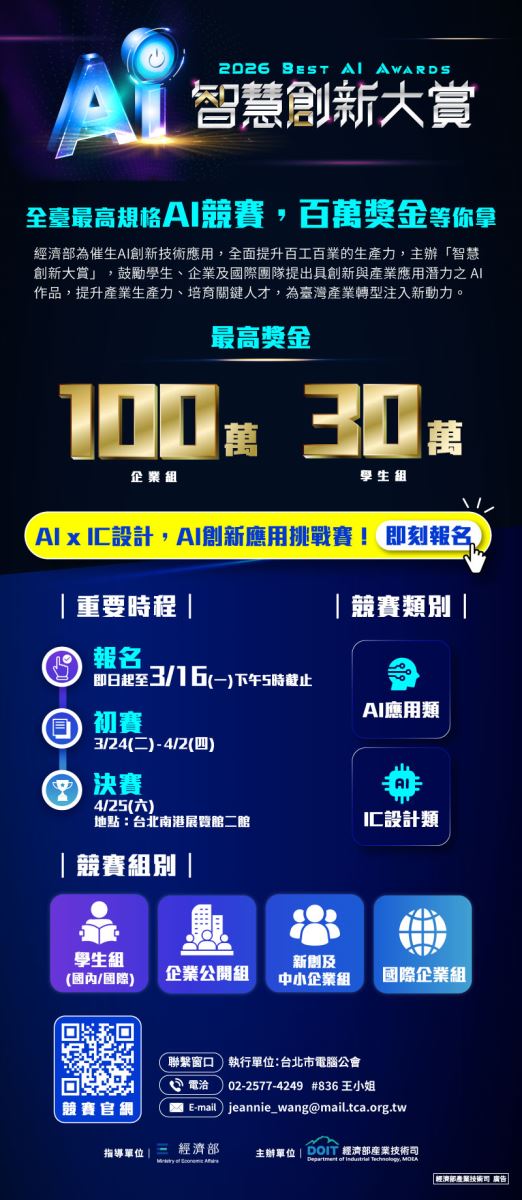 競賽分為「AI 應用」與「IC 設計」兩大類,除提供豐厚獎金外,得獎團隊另可獲得研發補助加碼、國際展會媒合等多項後續資源,協助技術落地與產業鏈結。